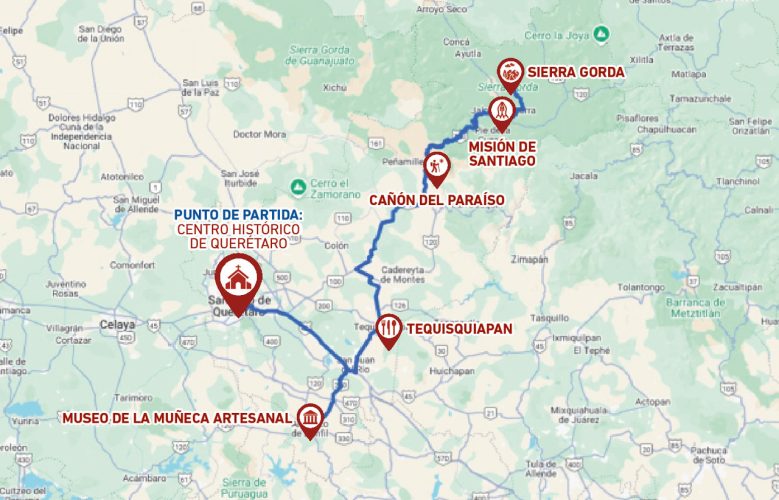 Esta ruta nos llevará a explorar sitios emblemáticos como el Centro Histórico y la Misión de Santiago; aprenderemos sobre la famosa muñeca Lele en el Museo de la Muñeca Artesanal; deleitaremos platillos llenos de sabor en el Pueblo Mágico de Tequisquiapan y viviremos una dosis de aventura en el Cañón del Paraíso y la Sierra Gorda.