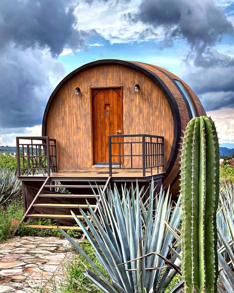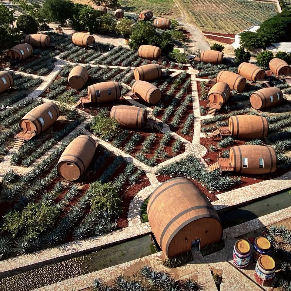 Normalmente las barricas de tequila, esos recipientes hechos de madera donde se guarda esta bebida, se encuentran almacenadas en bodegas frescas y oscuras. Sin embargo, parece ser que unas cuantas barricas se perdieron entre los campos de mezcal, y Hacienda la Cofradía decidió convertirlas, nada menos, que en habitaciones para los viajeros.